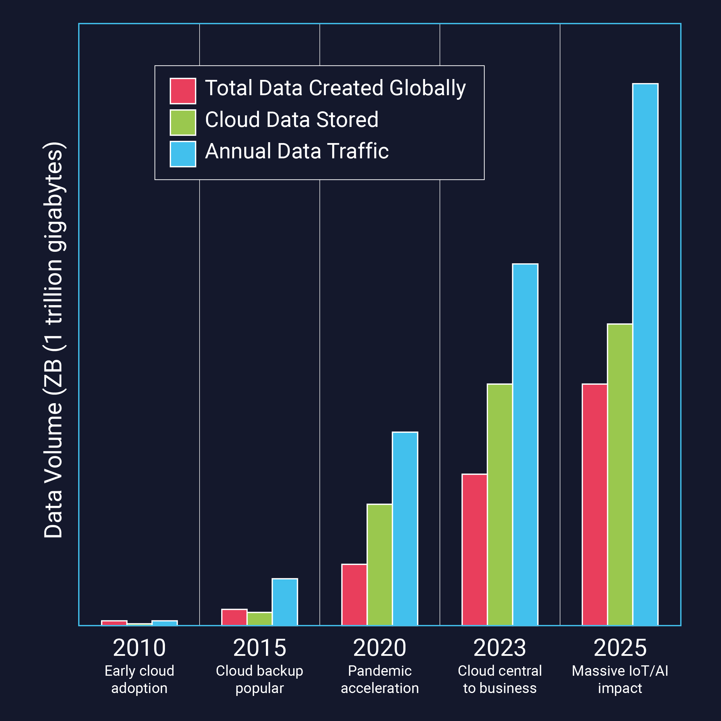 The volumes of data traffic and storage have grown rapidly due to digital transformation initiatives in business and the proliferation of digital interactions in everyday life (social media, eCommerce, IoT), means that many businesses struggle to handle these requirements with their on-premise hardware. It has therefore been necessary for organisation to turn to cloud solutions for their virtually unlimited storage capacity and powerful processing capabilities.